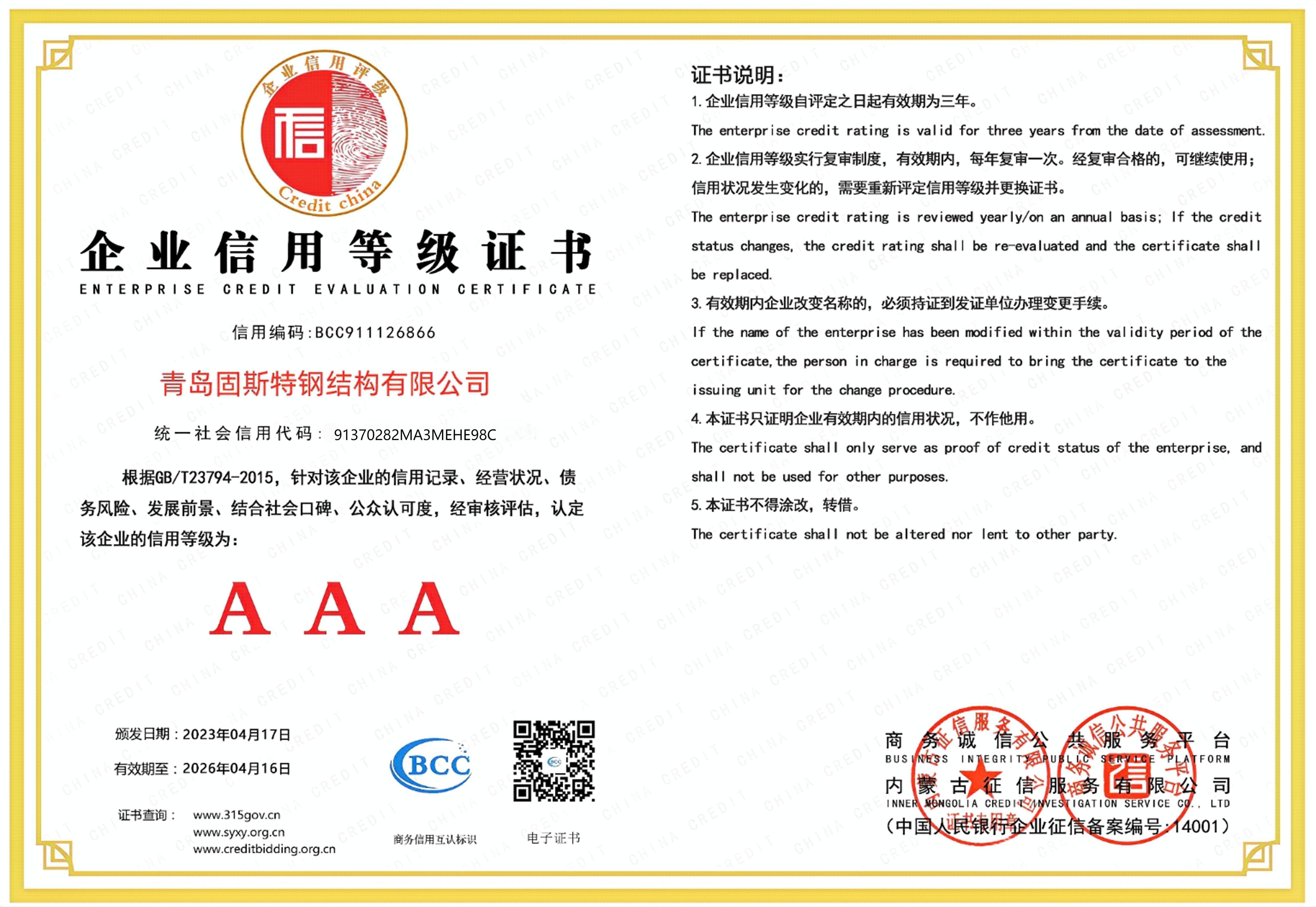 Il possède le certificat de qualification de gestion de projet sous contrat à l'étranger délivré par le ministère du Commerce de Chine, la certification CE (certificat EN1090), le certificat ISO9001, etc.